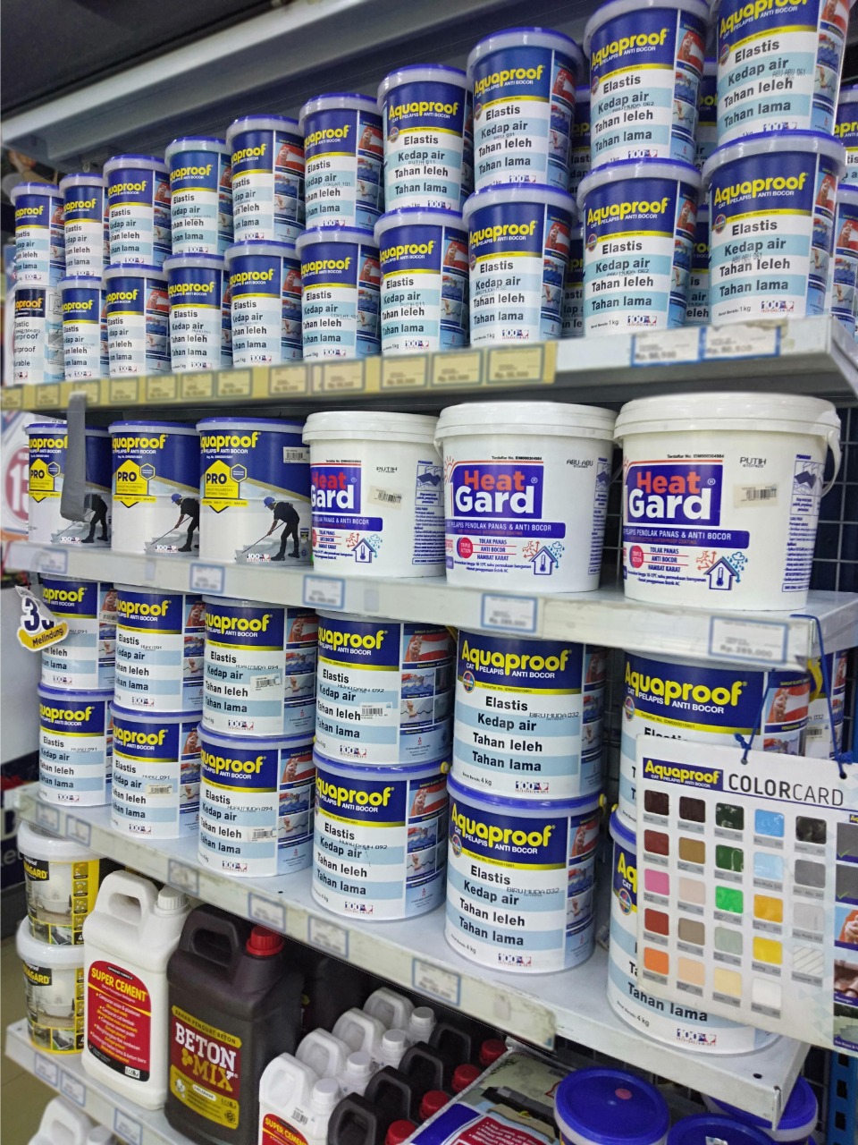 Aquaproof yang tersedia dalam 24 varian warna berfungsi optimal menahan air dengan diaplikasikan pada bidang yang terlewati air seperti dinding .
